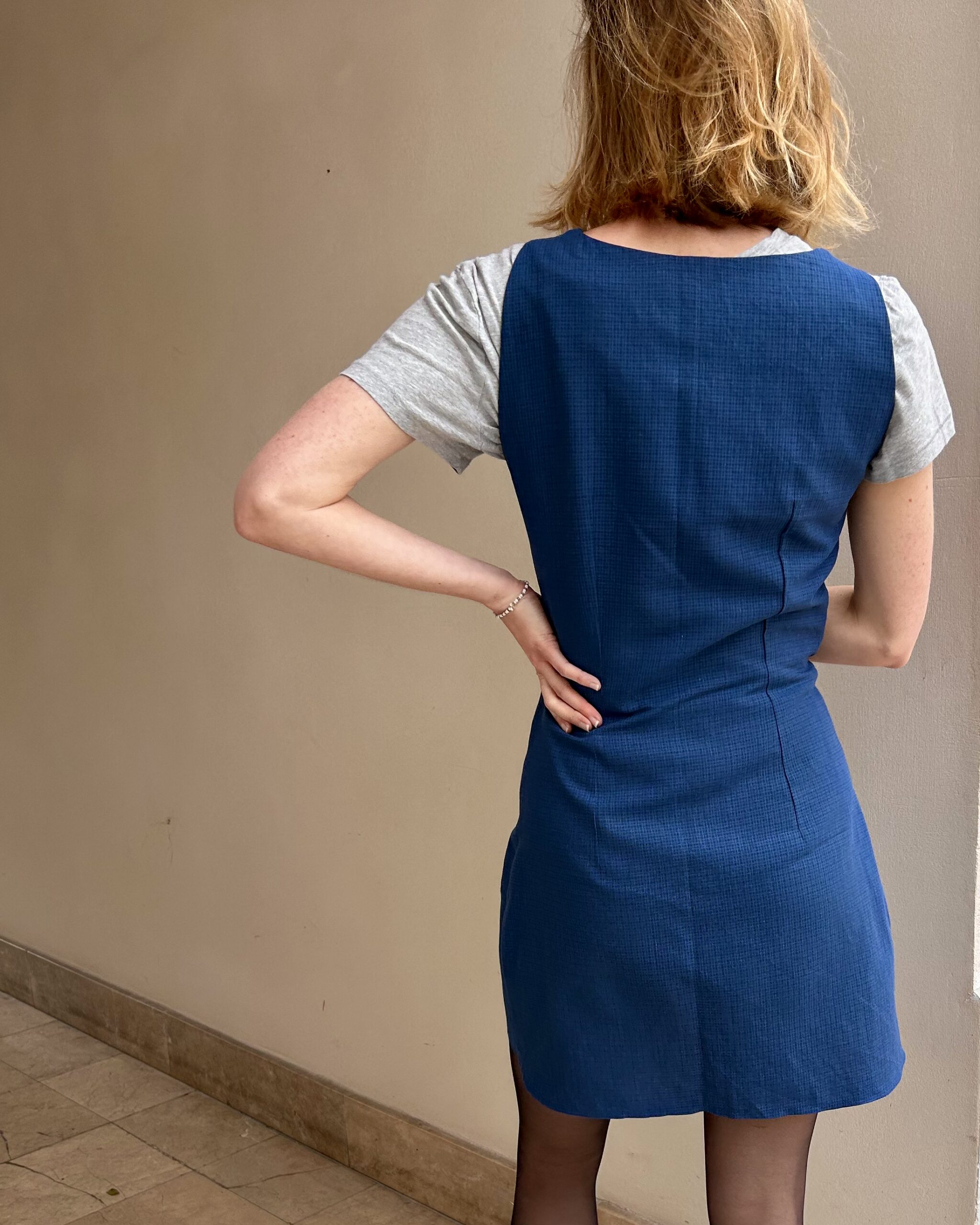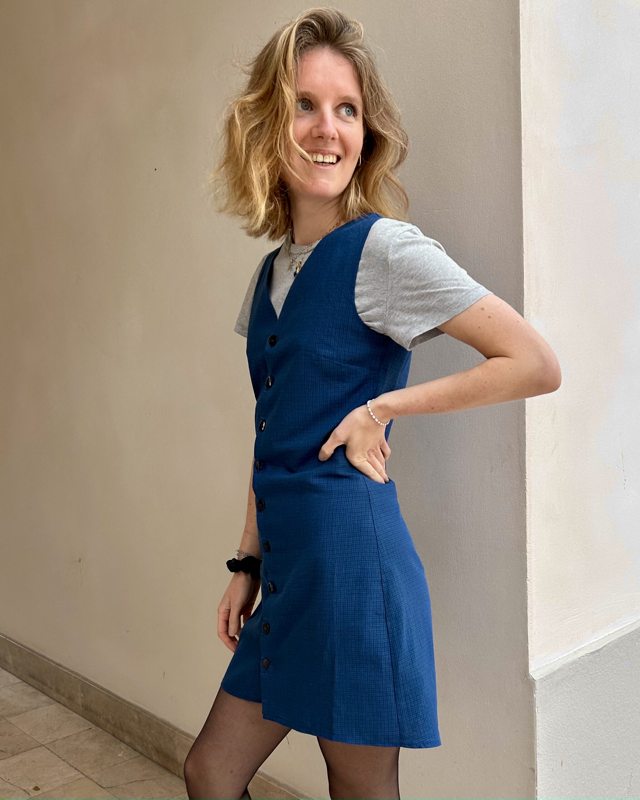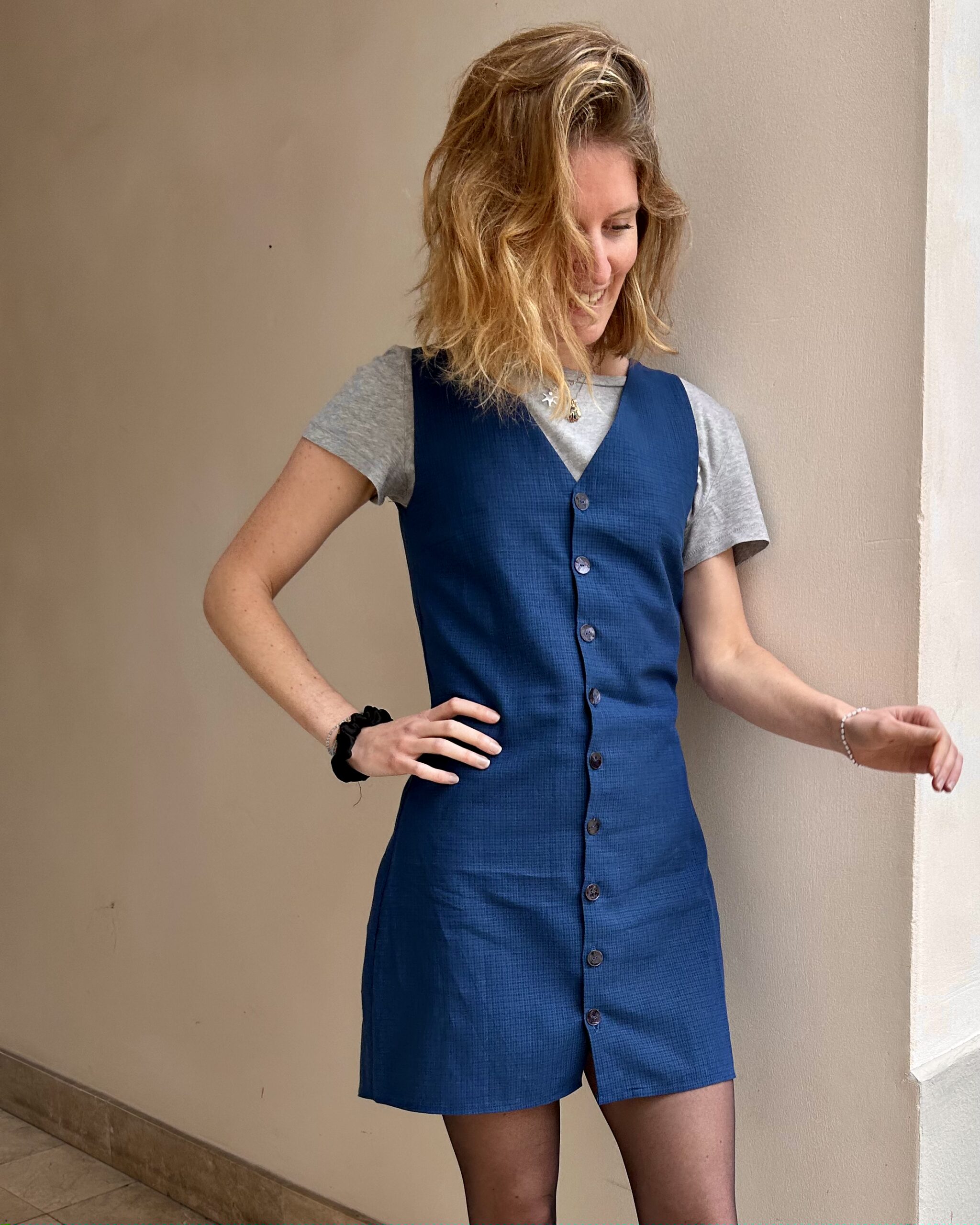 Robe courte sans manche en coton et lin. Taille ajustée par des pinces dans le dos. Elle se ferme par des boutons en nacre sur le devant.