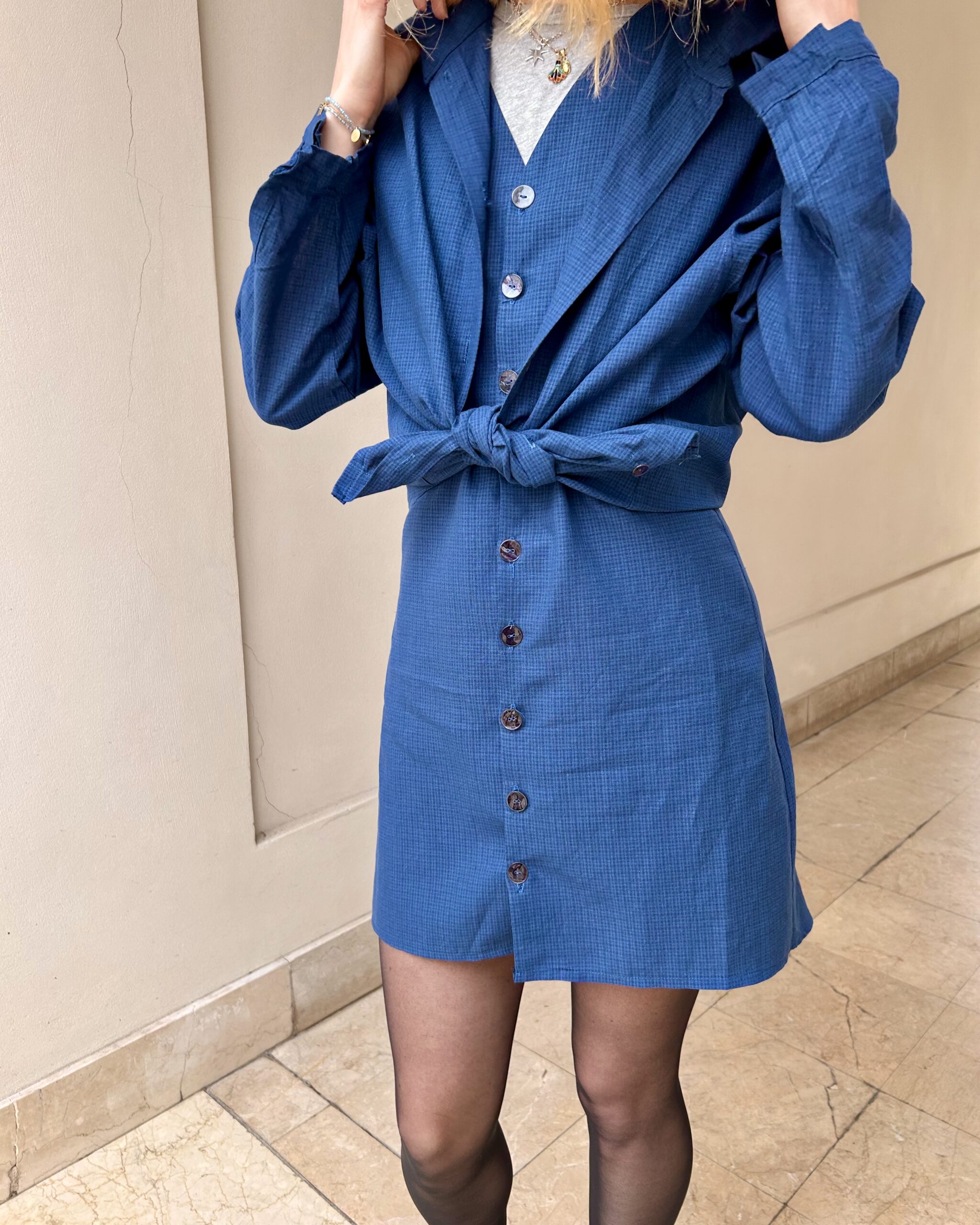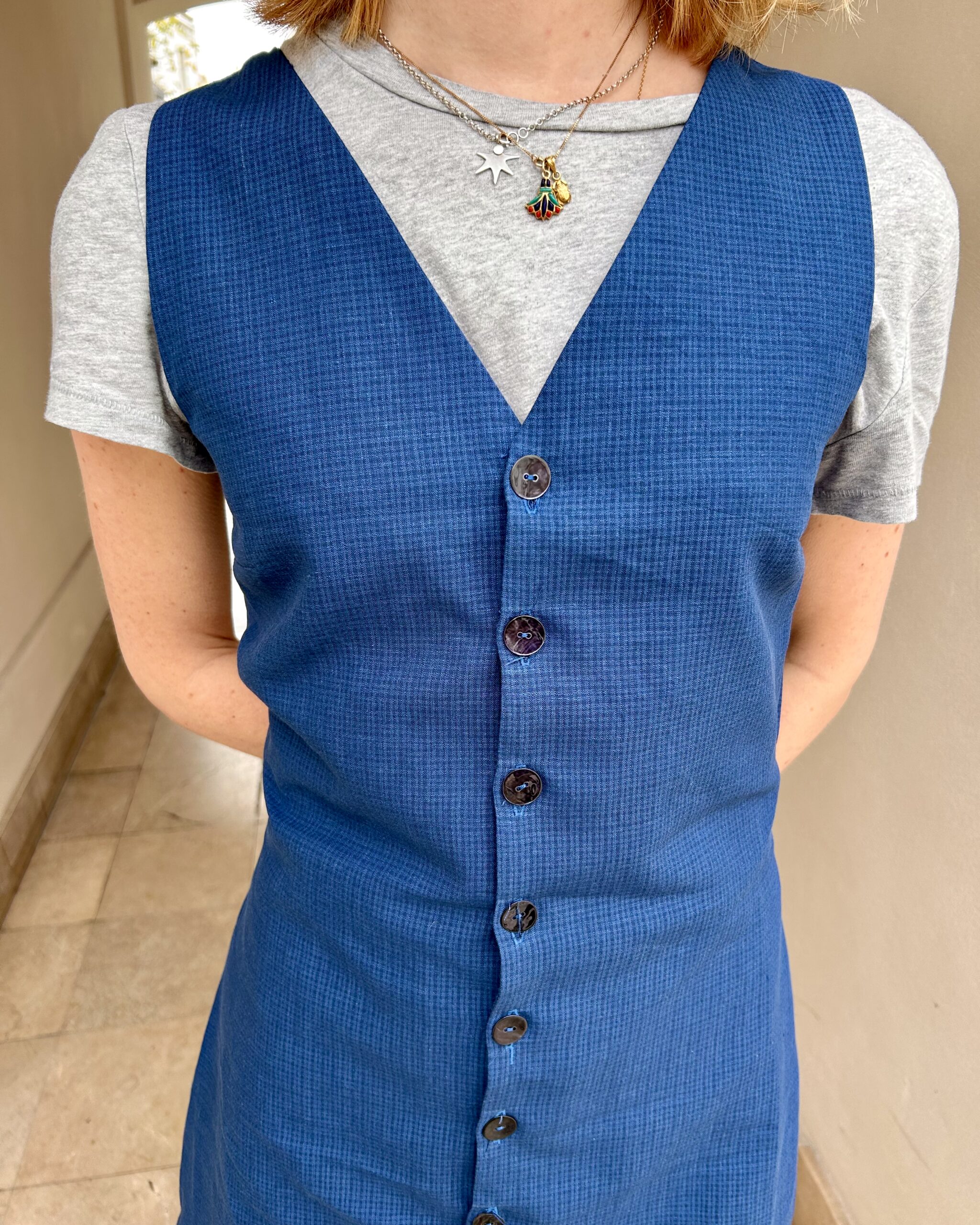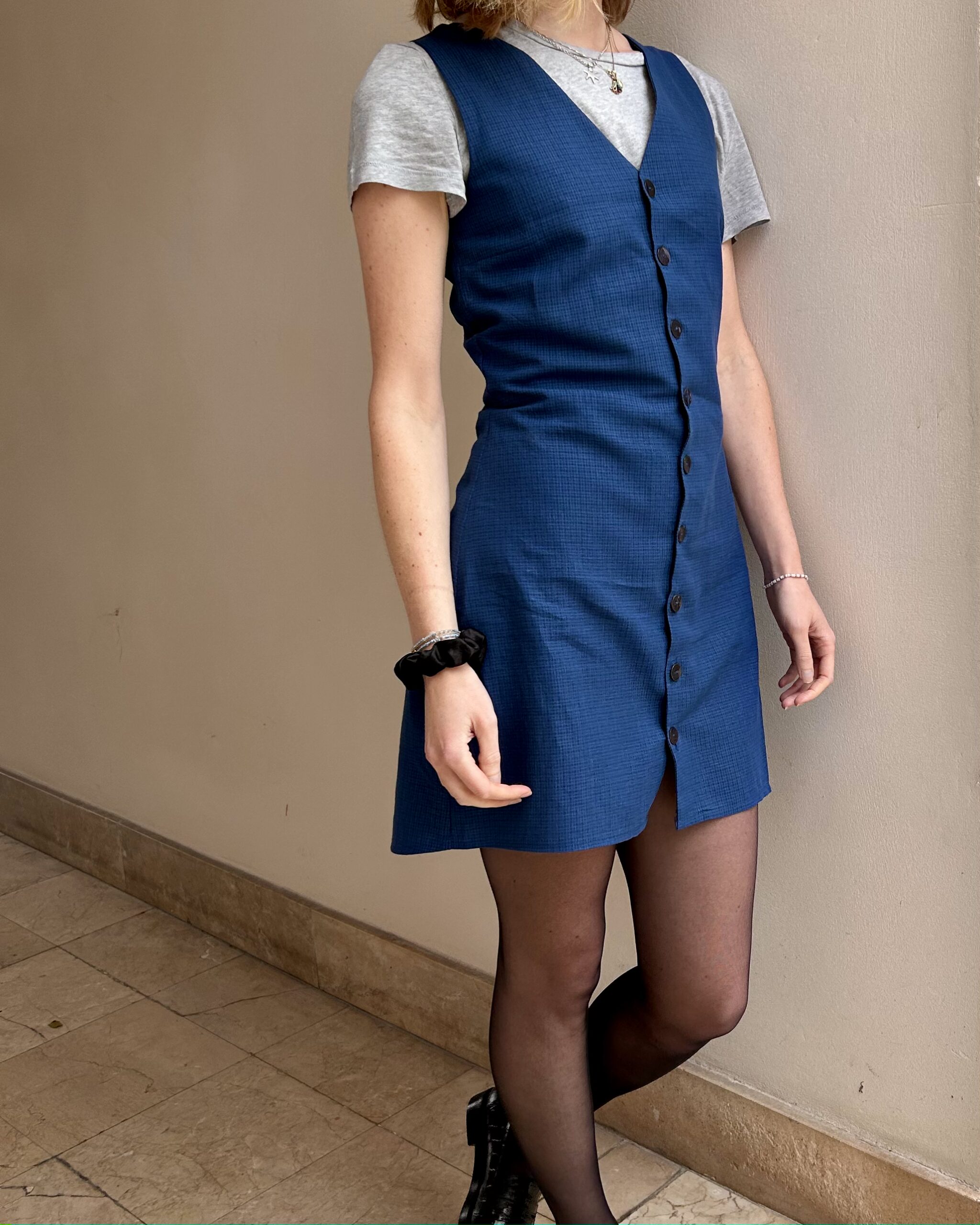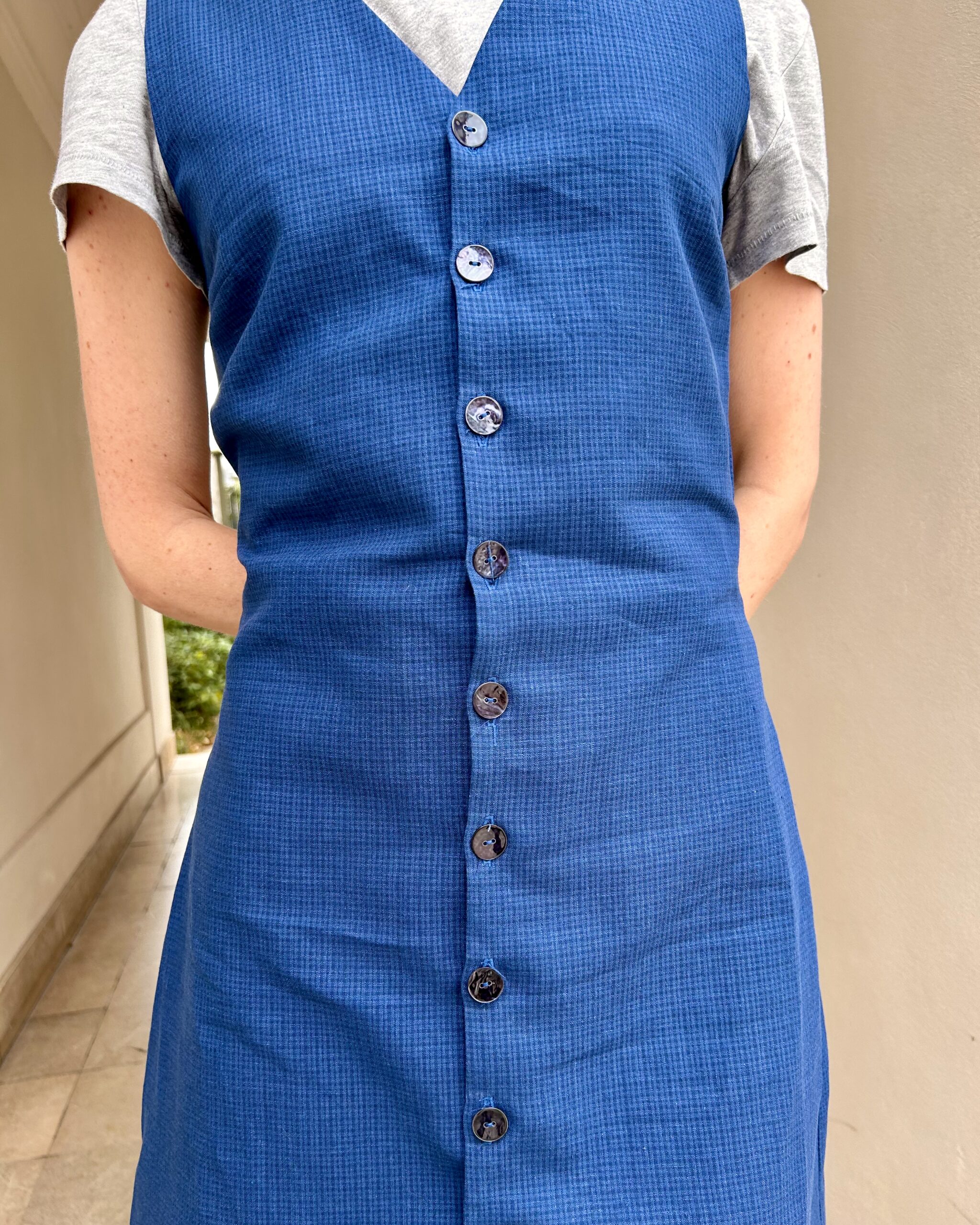 Robe courte sans manche en coton et lin. Taille ajustée par des pinces dans le dos. Elle se ferme par des boutons en nacre sur le devant.